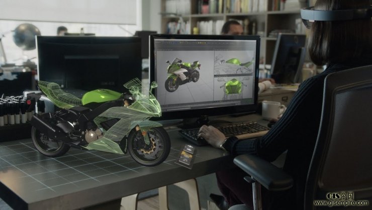 图中是微软员工利用HoloLens为摩托车进行 3D 建模,并结合Maya软件进行修改。由于可直接在HoloLens中看到类似于真实世界中的摩托车,因此不再需要通过 3D 打印,就可以把模型叠加到现实的摩托车上。