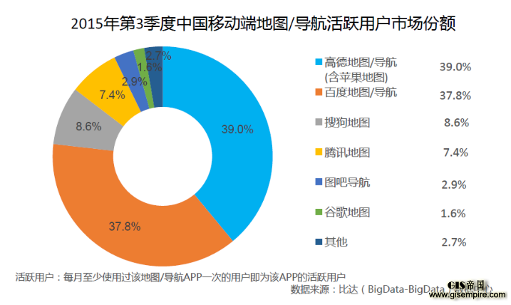 根据比达咨询的数据,2015年第三季度地图/导航市场份额中,高德地图/导航以39%位居首位,百度地图/导航以37.8%位列第二,两者加起来占到了近八成份额,数据垄断地位。搜狗地图和腾讯地图分别占8.6%和7.4%,图吧导航占比2.9%,已经基本退出了地图导航的战斗。