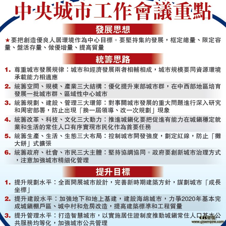 会议指出,城市是我国各类要素资源和经济社会活动最集中的地方,全面建成小康社会、加快实现现代化,必须抓好城市这个“火车头”,把握发展规律,推动以人为核心的新型城镇化,发挥这一扩大内需的最大潜力,有效化解各种“城市病”。要提升规划水平,增强城市规划的科学性和权威性,促进“多规合一”,全面开展城市设计,完善新时期建筑方针,科学谋划城市“成长坐标”。要提升建设水平,加强城市地下和地上基础设施建设,建设海绵城市,加快棚户区和危房改造,有序推进老旧住宅小区综合整治,力争到2020年基本完成现有城镇棚户区、城中村和危房改造,推进城市绿色发展,提高建筑标准和工程质量,高度重视做好建筑节能。要提升管理水平,着力打造智慧城市,以实施居住证制度为抓手推动城镇常住人口基本公共服务均等化,加强城市公共管理,全面提升市民素质。推进改革创新,为城市发展提供有力的体制机制保障。