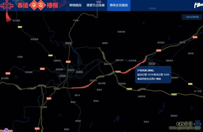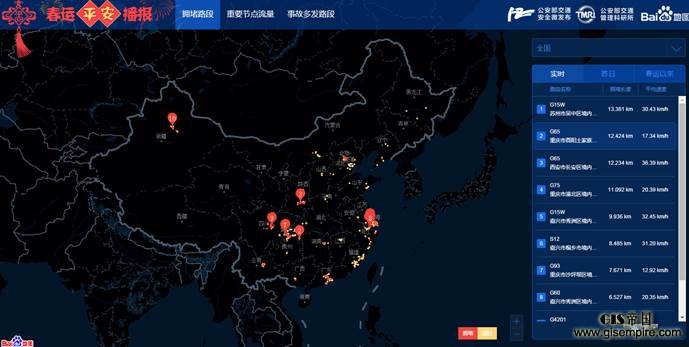 (春运“平安播报”可显示全国拥堵路段、重要节点流量以及事故多发路段)