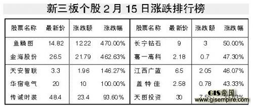 猴年首个交易日,有786家企业发生交易,其中,314家企业股票上涨,占比39.95%。133家企业涨幅0-1%,占比42.36%;149家企业涨幅1%-5%,占比47.45%;17家企业涨幅5-10%,占比5.41%;11家企业涨幅10-100%,占比3.50%。在股票上涨企业中,鱼鳞图(831885)涨幅高达470%,领跑猴年新三板股票市场。