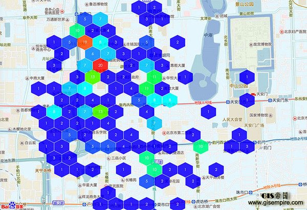 还有就是将地图区域规则的按网格来进行划分,如下图按蜂窝状网格来划分,在每个网格中统计相关信息,用不同颜色来展示每个网格数量的大小。