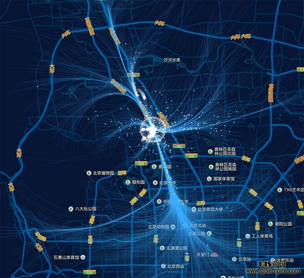 除了单纯的连线外,还可以对连线进行一些连线捆绑处理。如下展示的就是西二旗区域上班的人通勤的od连线捆绑效果。