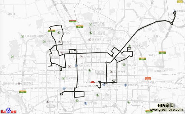 地理空间中的线数据是指一系列的点两两连线。如地图上的道路、河流、铁路等都可以用线数据来展示,可视化应用场景上经常用来展示驾车的路径轨迹,如下就是展示的某辆车一天的行车轨迹情况。