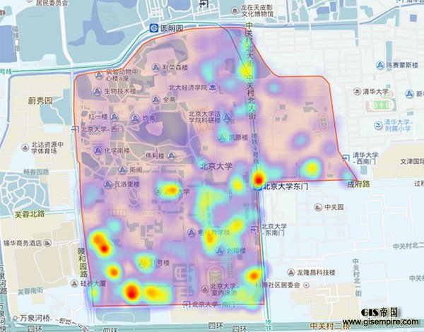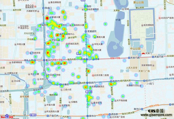 除了单纯的按网格来归类展示数据外,还有一种热力图展示的形式,如下也是刚才西单周边的银行数据用热力图的形式展示的效果。可以通过不同颜色来看出整体的分布情况,和网格区块划分展示相比,热力图可以提供更多一点的分布信息。