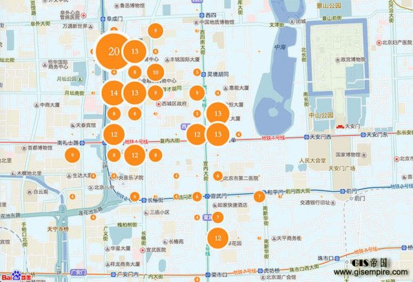 如下图就是通过点聚合来展示西单周边的银行分布,将距离接近的点都聚合到一个点来。