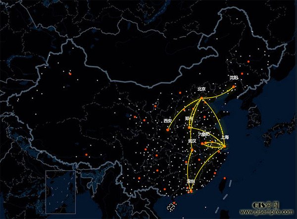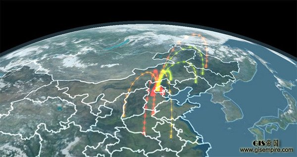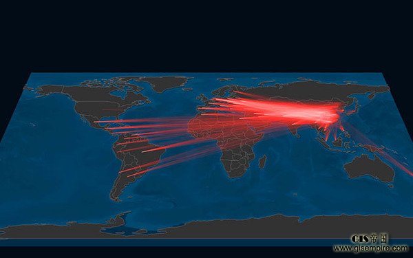 还有单纯的两点连线数据展示,如下是慧眼团队春节国外迁徙报告中把中国来源城市和出国国家之间进行连线展示,大部分人们选择的出国国家还是主要分布在中国的周边。