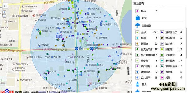 点数据是地理数据中最常见的一种数据,如poi数据,下图所示就是西单附近的银行,直接根据点的坐标标识在地图上。