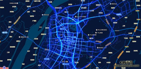 在地图上展示大量的轨迹数据容易会有叠加情况,造成视觉混淆,所有还是得分场景来展示。如上面是为了查看具体的某辆车的具体行驶轨迹,所以我们需要尽可能详细的展示这辆车的行驶轨迹细节,其他与之无关的信息尽量减少。但如果要是为了查看大数据的轨迹,目的就是理解我们数据的整体模式,而不是展现每一条线段,这时我们就可以对我们的轨迹进行简化抽稀合并处理。如下图我们展示的就是南京的出租车轨迹情况,轨迹叠加的越多的地方让它的颜色更亮一点,尽管有大量的轨迹重叠和交叉,还是可以看出大致的数据分布情况的。
