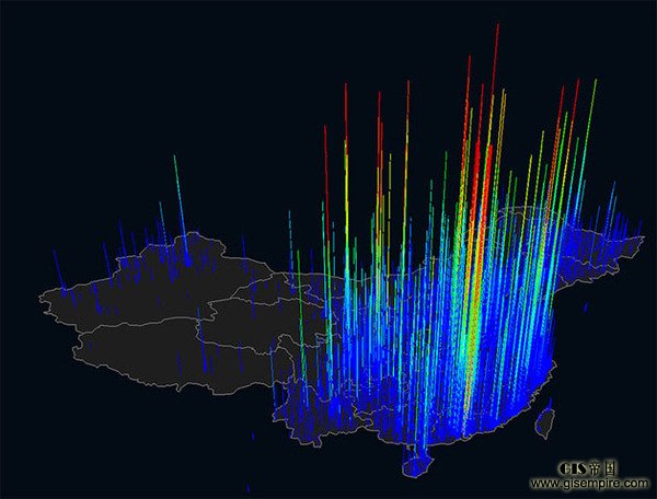 3d柱状图也可以用来展示每种网格区域所包含的数量大小,如下图就是某个时间百度地图用户的网格聚合效果展示。