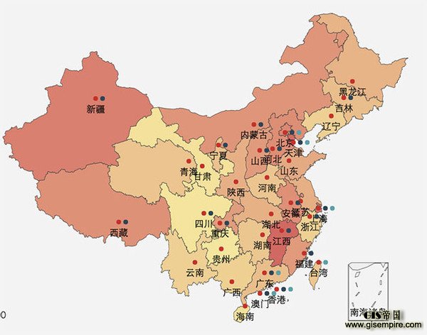 使用单纯的圆点在地图上展示数据是最直观反应数据在地图上的真实信息,能看出更多的细节。但是当数据量较大的时候,点数据之间会产生相互重叠的情况,这样就会影响对数据的观察。可以通过空间算法减少叠加的数据,或者是进行一些统计归类展示,尽量在有限的地图空间上反应出更多有用的信息。