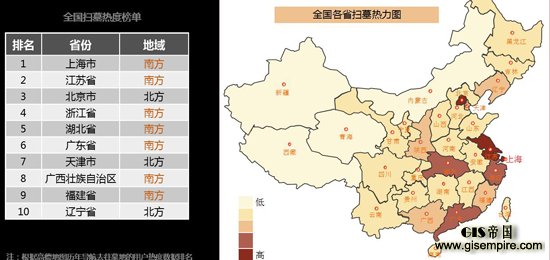 然而,中国南北方民众的清明出行需求有很大不同。根据高德地图历年导航去往墓地的用户热度数据排名进行预测,全国的上海扫墓客最多,其次分别是江苏省、北京市、浙江省、湖北省、广东省、天津市,广西壮族自治区、福建省、辽宁省。在上榜的10个省份中,有70%来自南方省份,仅30%在北方。此外,高德地图历年导航数据还得出结论:清明期间北方驾车出行用户中前往风景名胜的游客占比是南方的1.2倍,而南方去往陵园墓地的人数占比是北方的2.5倍。高德地图大数据分析团队认为,这可能是由于南方祠堂、宗庙较多,对家庭传统较重视,而北方过节仪式要相对简化。