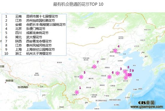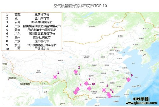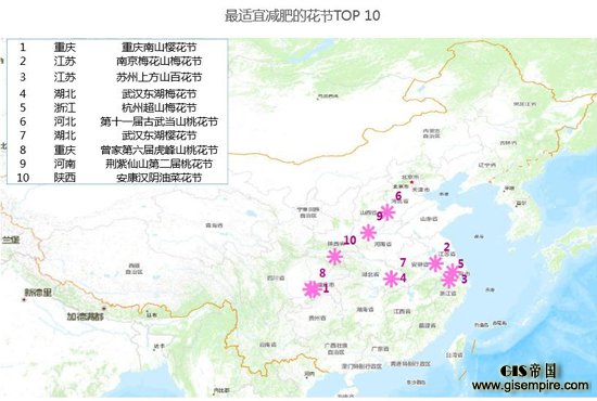 春季全国各地花节无数,高德地图POI大数据从不同维度对花节进行了分类和排列。根据2015年度366座城市PM2.5浓度排名,高德地图选取了空气质量较好的十大赏花地,除排名第一的西藏林芝外,其他皆位于我国南部地区。高德地图又选取在山上开办、且用户热度较高的花节,排列出最适宜减肥的十大赏花地,发现重庆南山樱花节最适宜“减肥”。