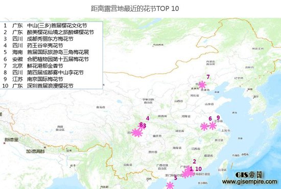 此外,根据赏花节周边的酒吧、夜总会、迪厅、KTV等POI数据综合计算,高德地图得出了最有机会艳遇的十大赏花地。其中昆明樱花节、苏州拙政园杜鹃花节和合肥长丰•陶楼桃花节占据前三。而根据赏花节周边5km的露营地等POI数据综合计算,中山(三乡)樱花文化节和广东醉美樱花仙境之旅醉蝶樱花节、四川成都秀丽东方梅花节位列前三,属于最适合露营的花节。