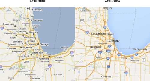 2010年4月(左)与2016年4月芝加哥地区谷歌地图对比。(Google/Justin O\’Beirne)