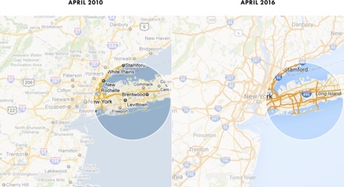 据美国媒体“商业内幕”报导,奥贝尔恩也是数字地图及其设计的专题撰稿人,今年晚些时候将有专著出版。他在文章中用图像对比的方式呈现了今天的谷歌地图与2010年版本有何不同。他发现,谷歌地图上呈现的美东城镇数量从46个减少到了8个,即减少了83%之多,连纽瓦克等规模仅次于纽约的二线大城市都看不到了。美中芝加哥地区和美西的旧金山湾区的城镇数量则分别减少了73%和77%。