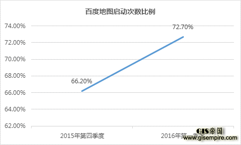 5月20日,易观千帆公布2016年1季度中国手机地图使用情况统计分析。分析显示,百度地图以70.9%的活跃用户覆盖率稳居市场第一。同时,百度地图启动次数比例以72.7%的优势领先,较排名第二的高德地图高出4倍之多。