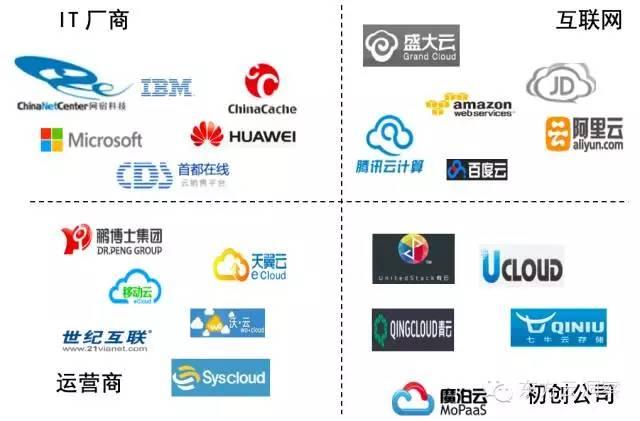 曾经就职于华为云的业内人士曾经撰文对2015年国内十大云厂商进行分析,他讲上榜企业分为四类:传统IT厂商、互联网巨头、电信及IDC运营商、初创公司。虽然联通和电信所占的市场份额不小,但据他观察,两者都并没有在开发合作伙伴和市场推广上有较大动作,似乎总是比市场慢一点。
