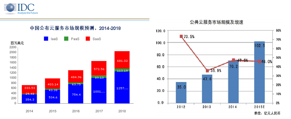 中国市场,向来是兵家必争之地,尤其是互联网创业风起云涌、中小企逐年增加的年代;而且随着公服务的兴起,公有云服务已有向其他行业延伸的趋势。IDC(国际数据公司)研究数据显示,市场整体规模约为70.2亿元人民币,比2013年增长47.5%,远快于2013年的35.9%。IDC曾经预测,2015年至2018年中国公有云市场年均复合增长率将达33.2%