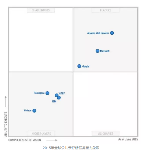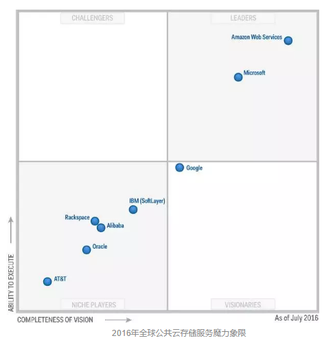 而在服务与技术潜力方面,研究机构Gartner在其最新的魔力象限报告中对全球云储存服务主要供应商进行了比较与定位。