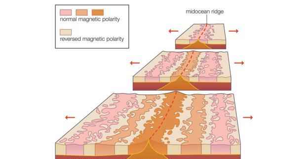地球上的许多岩石中含有磁性矿物。在岩浆固化成岩石之前,这些磁性矿物可以像小的指南针一样旋转并根据地球磁场进行自我排列组合。当冷却时,这些“指南针”凝固于固定位置。加拿大地质学家劳伦斯-莫利、英国地质学家弗雷德里克-范恩和德拉蒙德-马修斯等人发现,这种排列过程提供了更多关于“海底扩张”假说的证据。当岩石形成后,会沿着山脊的两侧滚动,它们包含了成千上百万年间地球磁场的变化记录。对这些记录的研究就是所谓的“古磁学”研究。通过“古磁学”研究,现在越来越多的地质学家认可了赫斯以及魏格纳的理论,即地球的地形是在不断变化的。