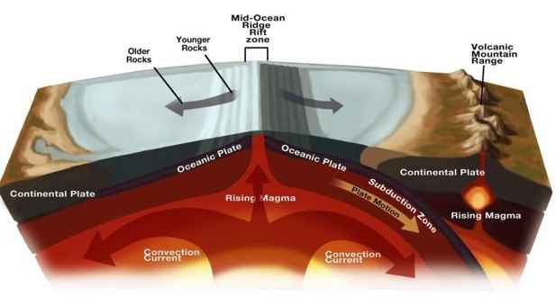 美国地质调查局地震学家苏珊-休解释说,“这就像一大锅汤,板块就像是漂浮于汤面的面包皮。”地球的地壳分为两层,上层为岩石圈,是地壳中坚硬、冷却的部分;下层则是软流层,其中炽热的熔岩向上运动,有时会从洋中脊部位喷发而出。所有这些就是板块运动的机制。板块可能会相互碰撞,也有可能互相分离。有时,有的板块还可能会俯冲切入到相邻板块之下,其岩石就可能会重新“回炉”到地球内层。地壳的板块运动就像是一场永恒的战争,它们一直在争抢成为地球的脸面。