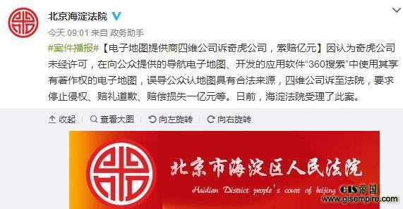 据了解,四维图新是国内较大的数字地图供应商。今年6月,四维图新以著作权侵权为由将奇虎360诉上法庭。四维图新认为,360在其“360搜索”网页端及移动端中使用了四维图新享有著作权的电子地图数据,奇虎公司未经许可,在向公众提供的产品中使用其享有著作权的电子地图,误导公众,要求其停止侵权、赔偿损失1亿元。