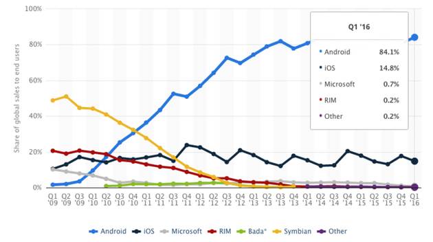 2016年第一季度移动端操作系统市场份额:Android 为 84.1%