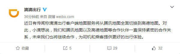 在一番较量、妥协之后,5月中旬阿里巴巴发布的2016财年年报显示,阿里巴巴和蚂蚁金服将分别认购滴滴出行2亿美元优先股,总计4亿美元,阿里巴巴退出对神州专车的投资。随即有传言称:“滴滴出行客户端地图服务将从腾讯地图全面切换到高德地图。”滴滴又不得不出面澄清: