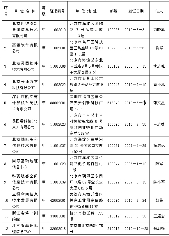 国家测绘地理信息局的官网信息显示,在“全国甲级互联网地图服务测绘资质单位名单”中,有四维图新、高德、搜狗、百度、新浪、长地万方、搜房、中国移动、超图等166家企业、单位。在另一更为稀缺的“导航电子地图资质单位”中,12家企业、单位名列其中: