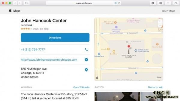 苹果现在已经在其地图数据库中发布了可以显示地标和信息点(POI)的公共网页,该网站的链接可以显示地点的一些细节,例如位置、名字、电话号码和评价。值得一提的是,其设计也和 iOS 10 的地图应用一样。