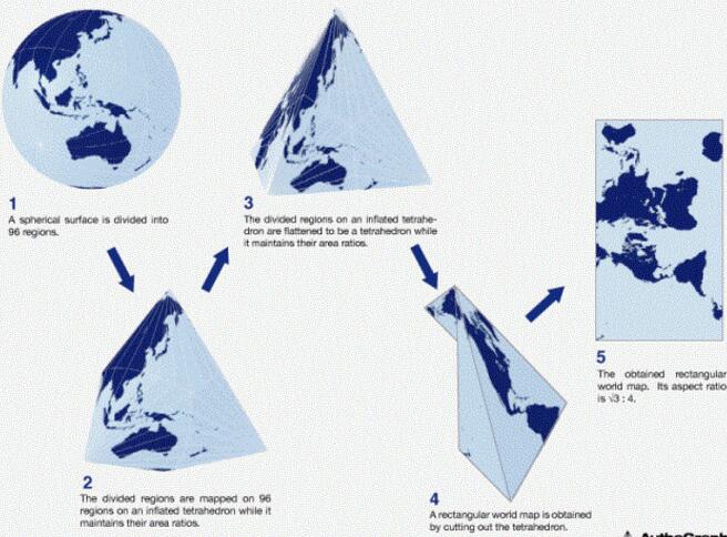 而新出来的AuthaGraph设计旨在修复这一点,它将全球分成了九十六个大小相同的部分,接着将这些维度从球面转移到了四面体上,并最终生成成品。