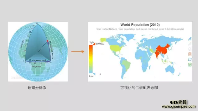 地理坐标系是使用三维球面来定义地球表面位置,以实现通过经纬度对地球表面点位引用的坐标系。但是我们在进行数据可视化的时候一般用投影的方法把其从三维数据转化成二维的平面图形。