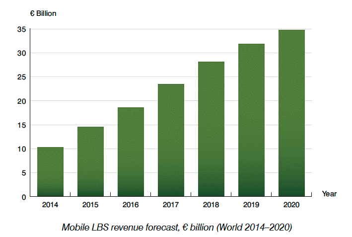 全球移动位置服务(即LBS)的市场规模将从2014年的103亿欧元增长至2020的348亿欧元,复合年增长率达22.5%,这是瑞典Berg Insight公司发布的最新预测报告。