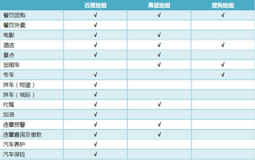 此外,易观报告还针对目前中国主流手机地图生活服务O2O生态布局进行了统计分析,从生态布局图中可以看出,百度地图覆盖了包括餐饮团购、电影等目的地服务,及代驾、加油等用车服务在内的共14个O2O生活服务品类。高德地图、搜狗地图则较为侧重在目的地服务范畴,分别覆盖了8个品类和4个品类。